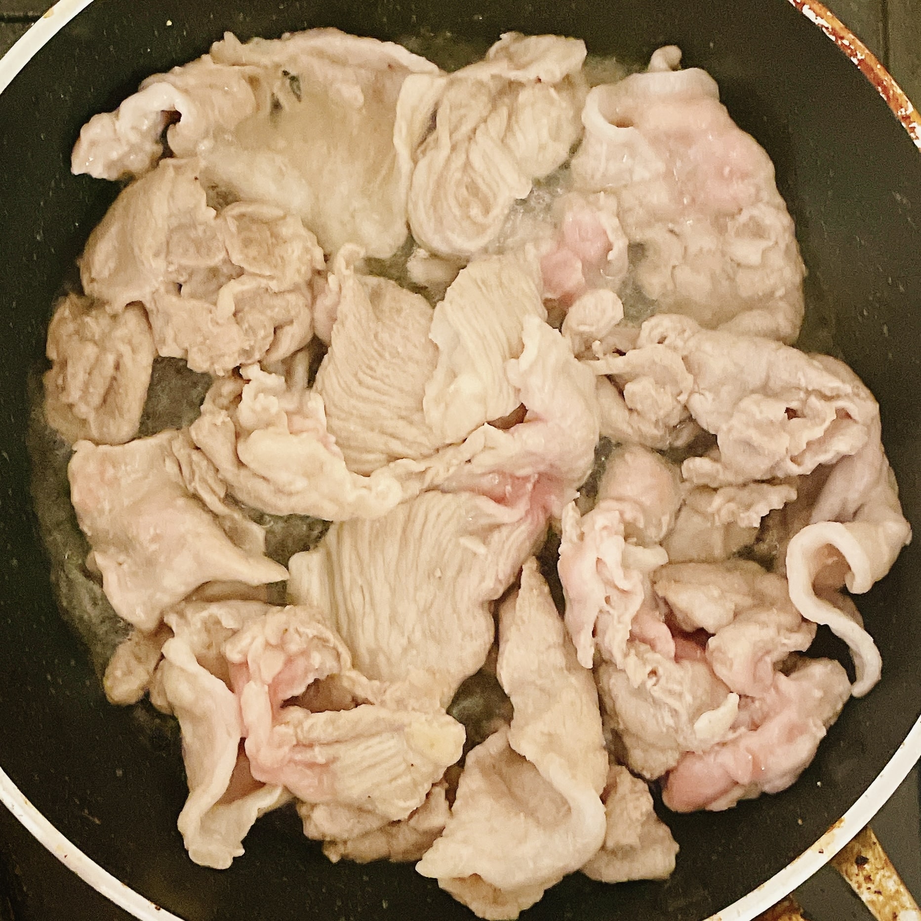 ③鍋に湯を沸かして、豚肉の色が変わるまで約2分ゆでる。その後水でさらう。