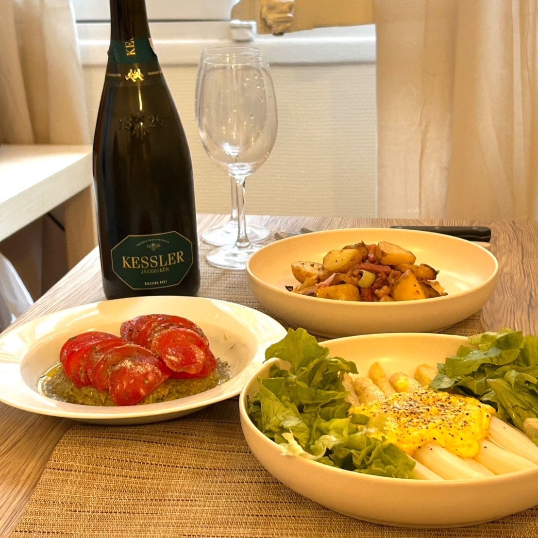 ドイツのスパークリングワインが手に入ったこの日はドイツ料理の日。ジャーマンポテトと、旬のアスパラガスを使った前菜を作ります。