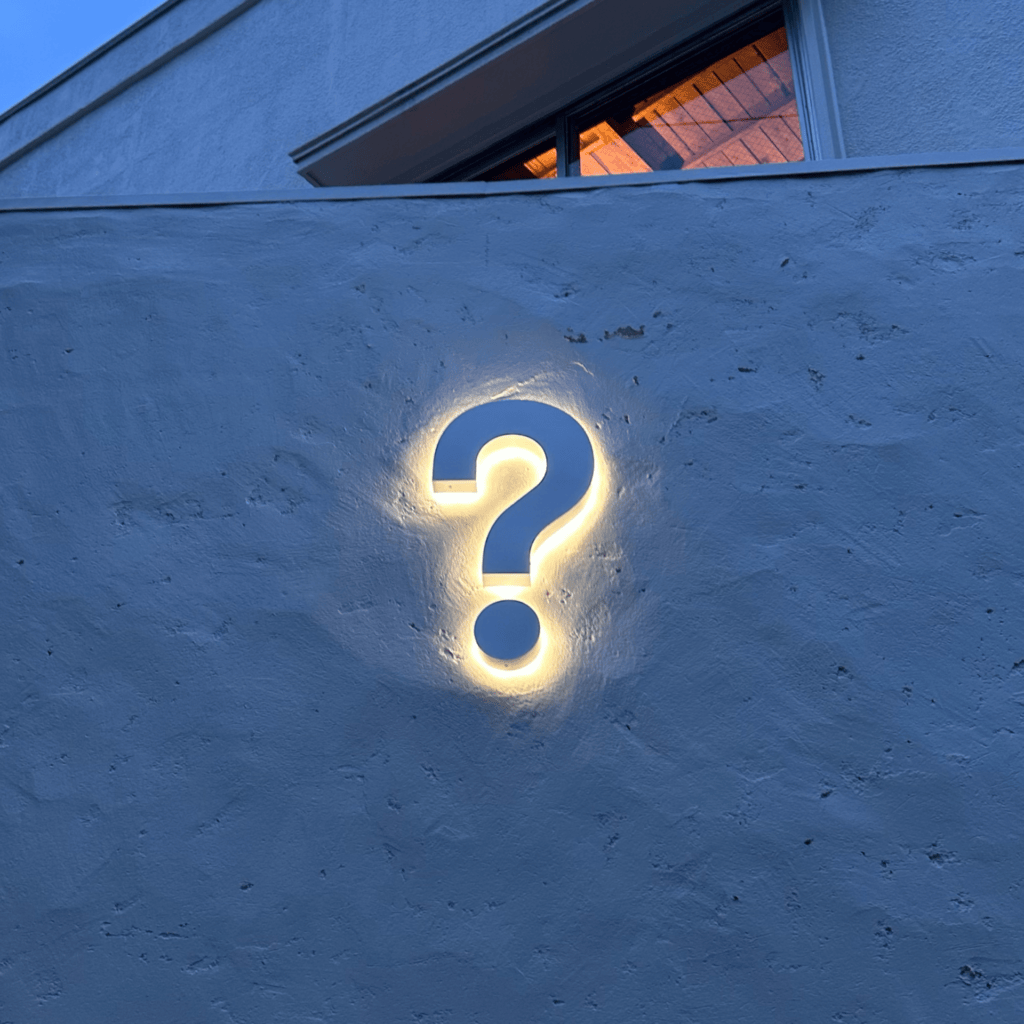 洗練された白い建物は都内らしいオシャレな外装で、上の「?」マークが特徴的。