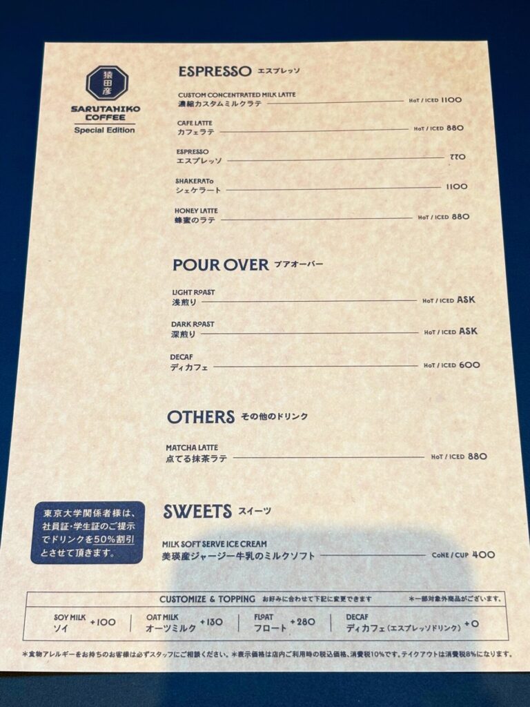 その分ちょっとお値段が張るのですが、なんと東京大学の構成員は学生証などを見せるとドリンクが半額になっちゃうんです👀