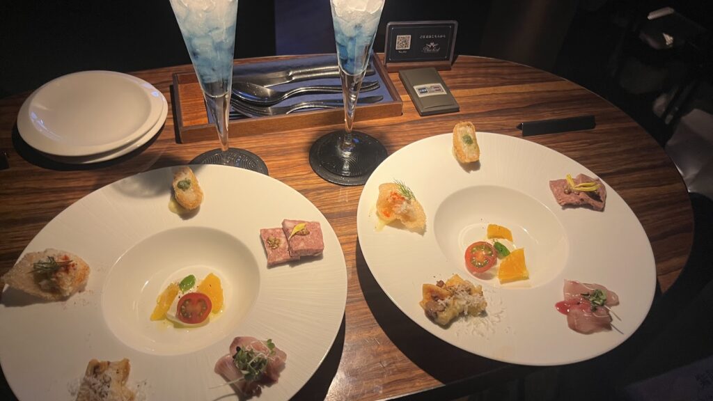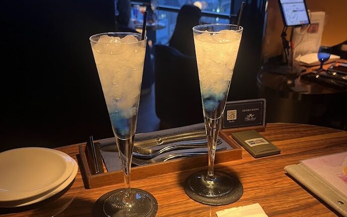 最初に提供されるのはオリジナル乾杯カクテルという綺麗なブルーのカクテル🍸