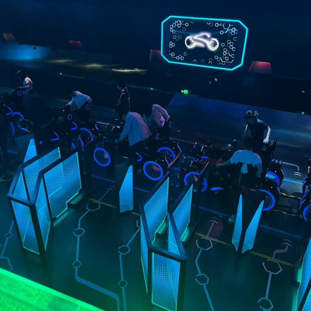 近未来的なQラインを抜けると、バイク型のアトラクションが見えてきました。最高時速96kmで、ディズニーパークではこれが世界最速なんだとか!