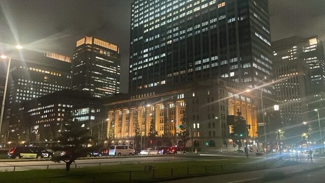 朝も、もちろん気持ちが良いですが、私のおすすめは夜の散歩です。皇居周りの近代的な建物の光がとてもきれいに映ります。