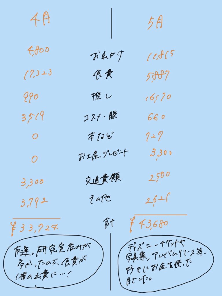 直近2ヶ月の出費を計算してみました!!あくまでも実家暮らしの私の出費の一例なので、参考程度に🙏