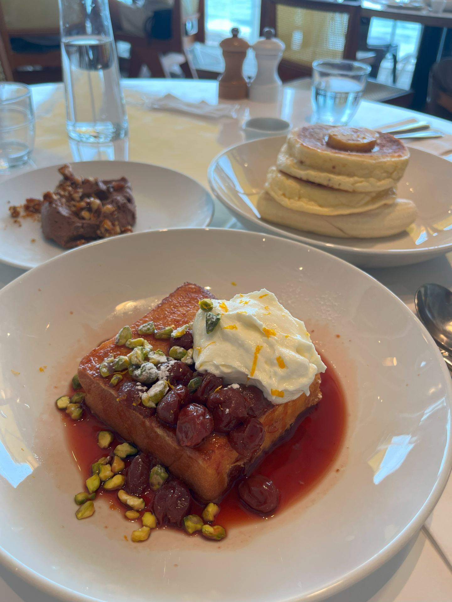 私はふわふわなフレンチトーストにチェリーのコンポートシロップとピスタチオ、グリークヨーグルトがのせてある「フレンチトースト – チェリーコンポート、グリークヨーグルト」を注文してみました!