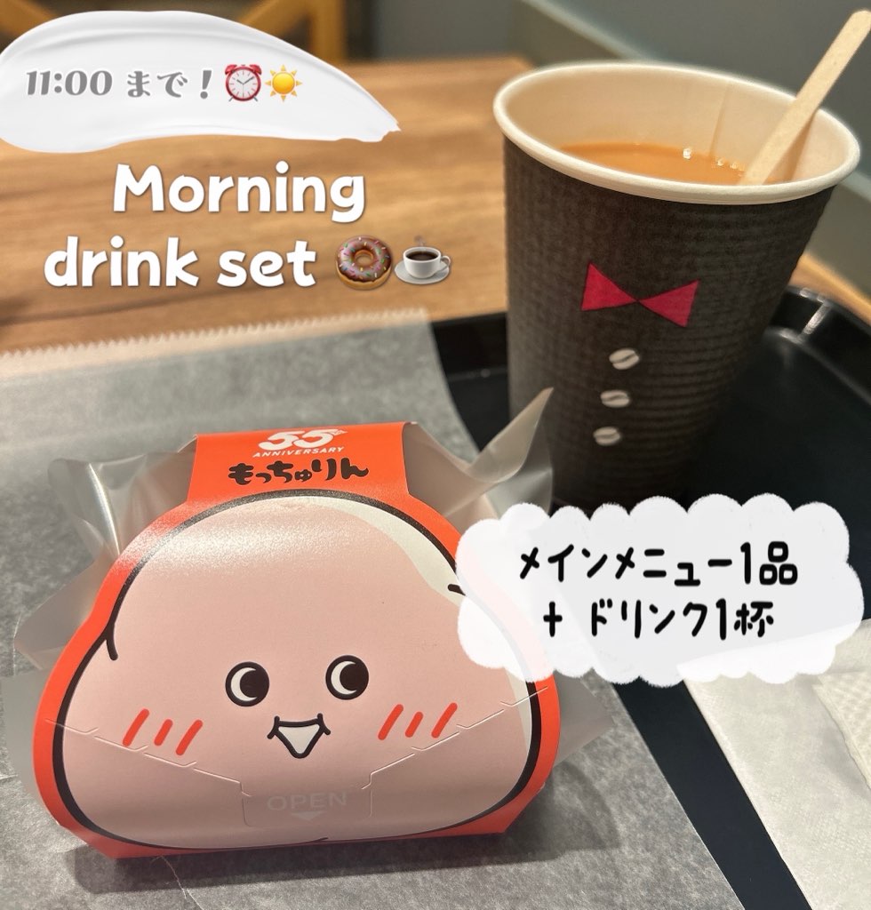 朝の11時までメインメニュー1品とドリンク1杯のセットメニューがあります。メインメニューにはドーナツやもっちゅりんの他にパイやマフィンも選べます。テイクアウトも可能みたいなのでぜひ利用してみてください♪