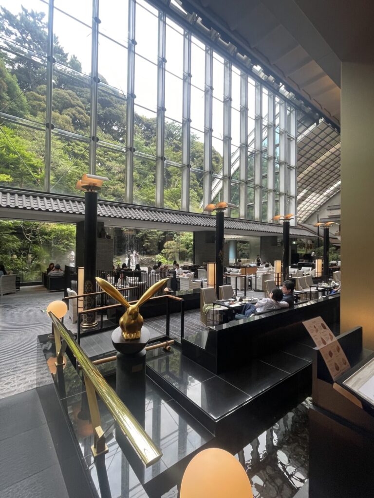 中はとても天井が高く開放感があり、窓からは庭園の滝を見ることが出来ます。ここなら、雨の日でもまた違った風景を楽しむことが出来そうです!🌧️