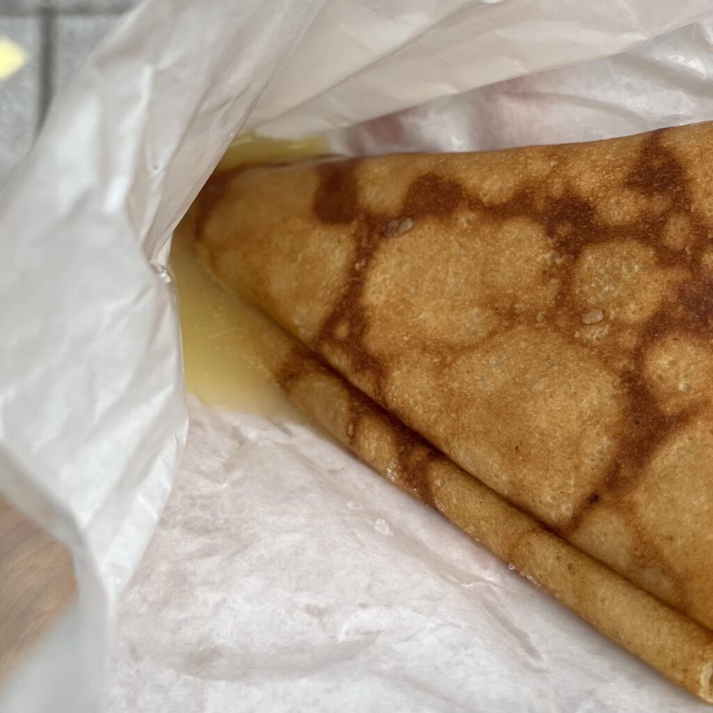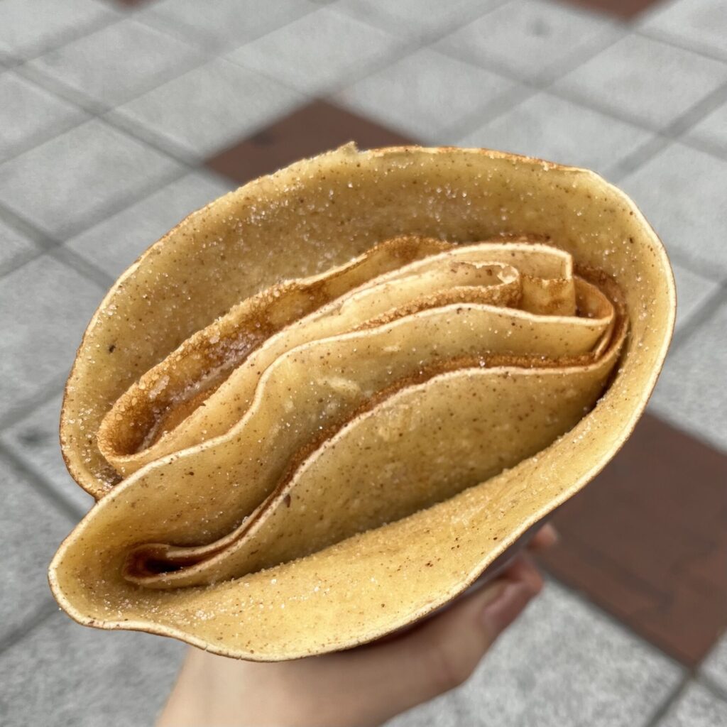 もちもちなのに香ばしさを感じるのは、この焼き目のおかげでしょうか。下に行くにつれて、溶け出したバターがじゅわり。これこそシュガーバタークレープの醍醐味。背徳の、幸せの味です。