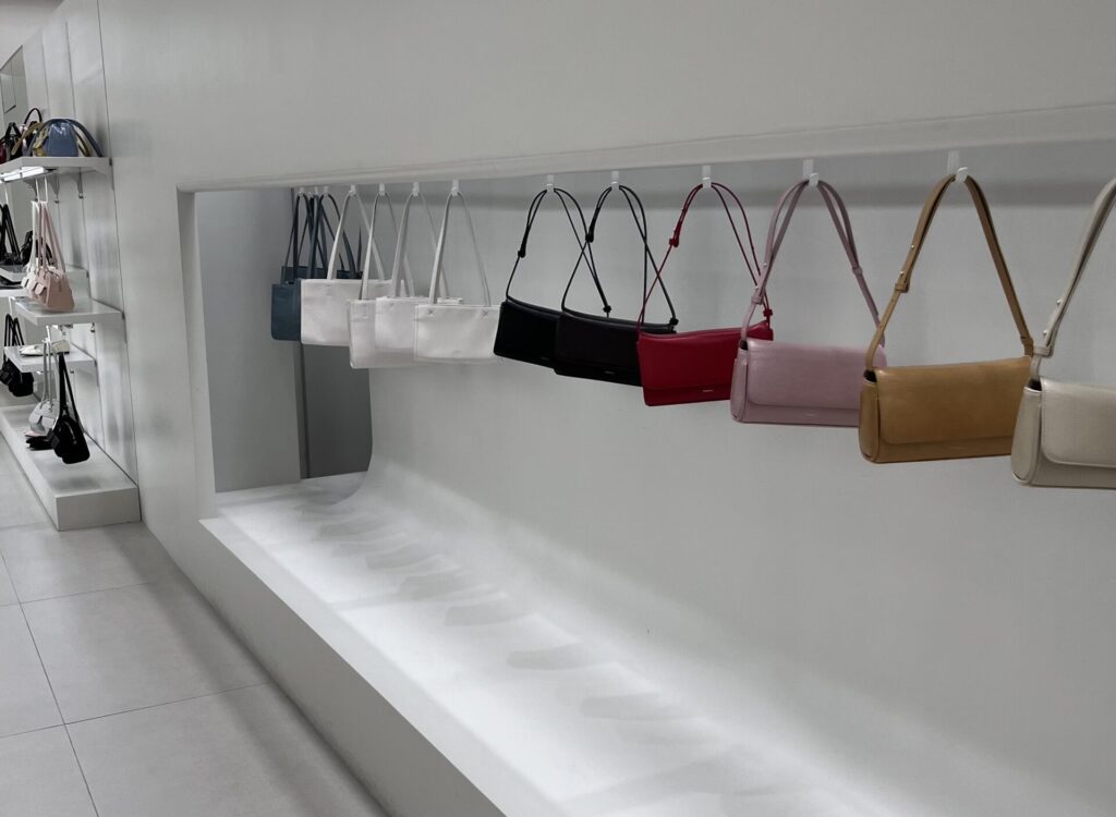 この写真は回転寿司のようにカバンが回っているレイアウトで、ここソンスのスタンドオイルの目玉ポイント! 2階建ての店舗の2階にはこのようなひと工夫あるレイアウトで展示されています。