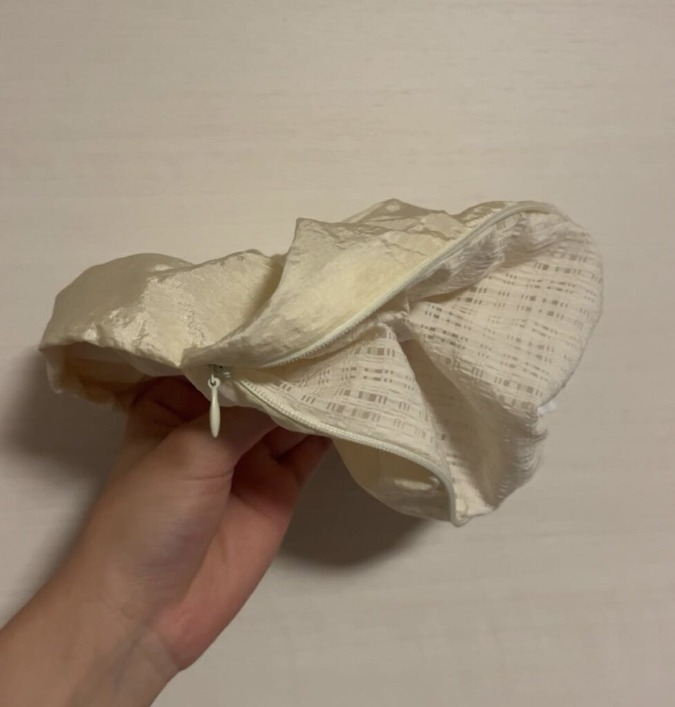 このシュシュは最近流行りの大きいだけではなく、縫い目の部分に付いているチャックを開けると広がりさらにボリュームを増すことができるという仕組みになっています。