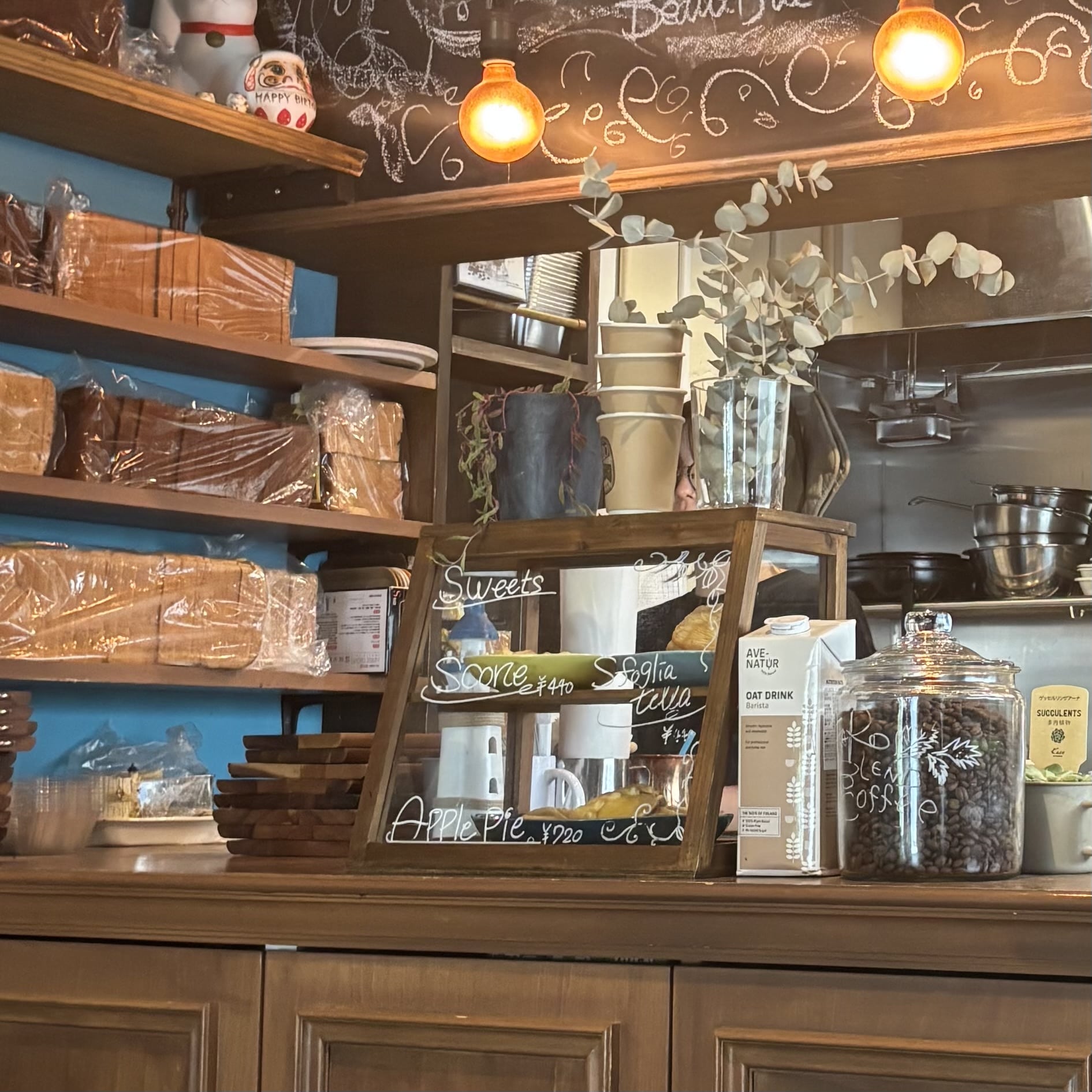 植物や木目インテリアで、自然豊かで温かみのあるカフェになっていました。