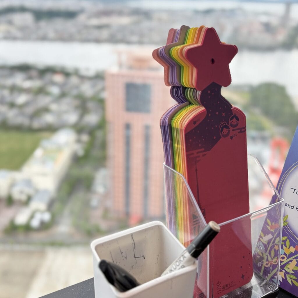 福岡で最も星に近い地上123mに位置する展望3階には、自由に短冊を書けるコーナーが。