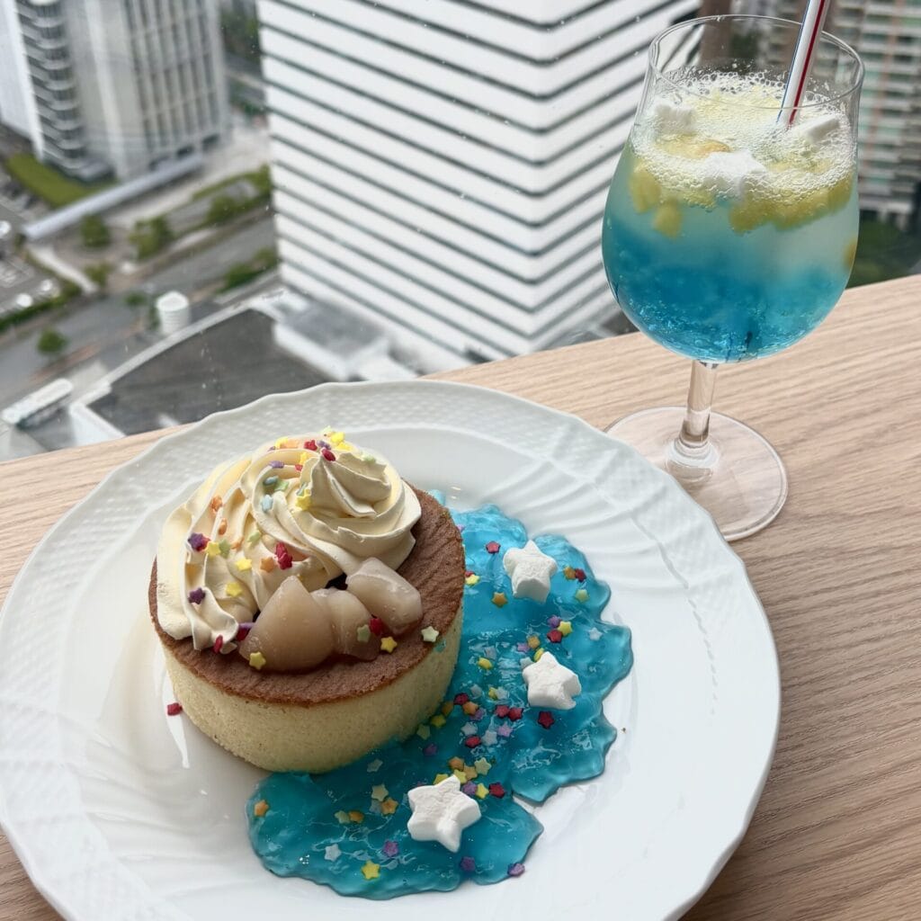 マスカルポーネチーズを使用したホイップクリームと桃がトッピングされたスフレパンケーキ。星型のマシュマロやフレーク、ブルーゼリーで天の川のように彩られています。