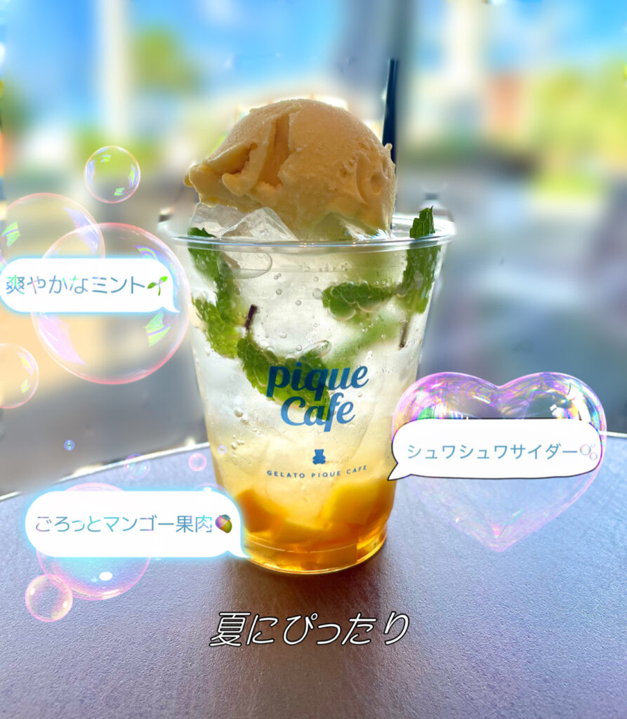 ジェラートピケカフェで販売されている、初夏の期間限定メニュー! フルーツが入っていてカラフルな見た目が可愛い♡暑い夏にぴったりの清涼感たっぷりのドリンクです。