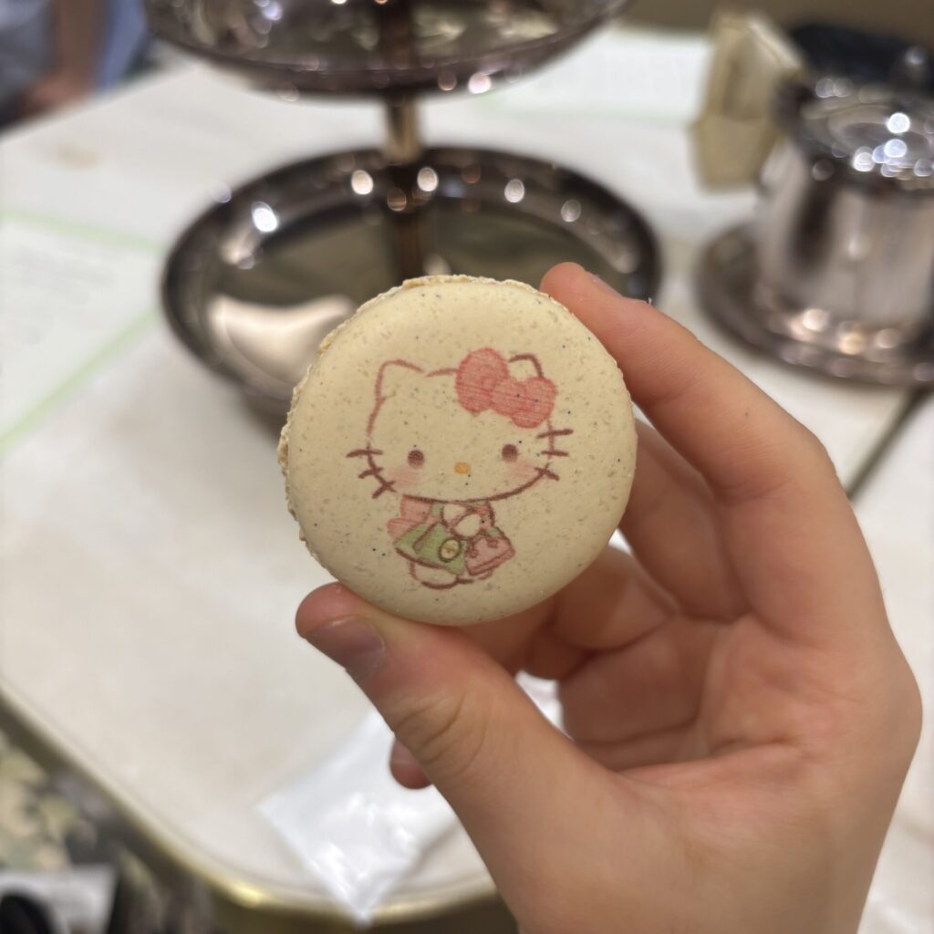 もりもりのクリームにマカロン、ロゴとキティちゃんのチョコレートがトッピングされています。