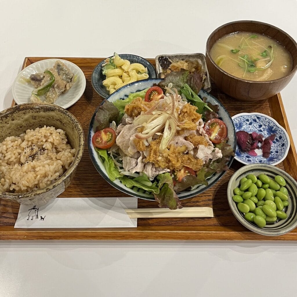 メインには、日替わりメニューの豚肉の冷しゃぶ 香味だれ、ごはんは玄米をチョイスしました。十五穀米が人気だそうですが、もちもちしていておいしい玄米が店員さんのおすすめ! (※数量限定)
