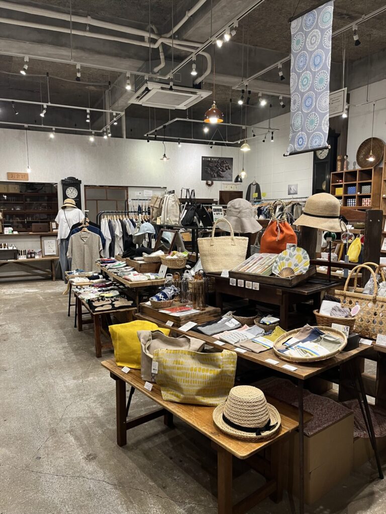 入って左手側の雑貨販売スペースには、衣類、紙製品、器、食料品など、さまざまな商品がずらり。日常に取り入れたい洗練された日用雑貨から、誰かに贈りたくなるようなセンスの光る小物まで、素敵なアイテムに出会うことができます。