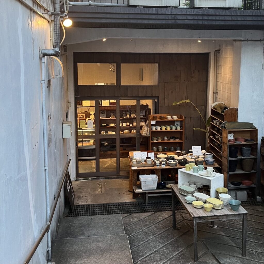 「四歩」は、吉祥寺駅から徒歩10分ほどの静かな住宅街にある、お食事と雑貨のお店です。入り口にはすでにかわいらしい器がずらりと並び、思わず足を止めたくなるほど。入って正面がカフェスペース、左手側が雑貨屋さんになっています。