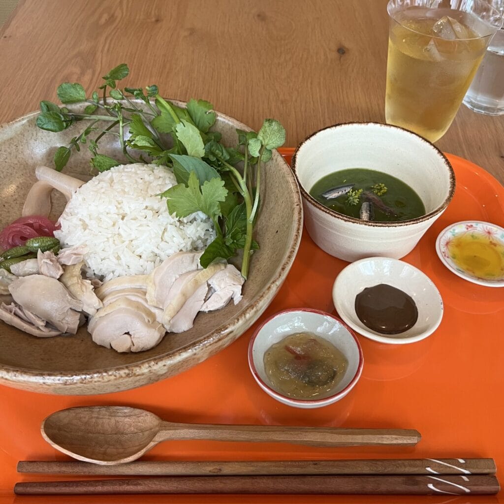 私は、ランチメニューから カオマンガイ (¥1,600) と、その日のおかずとお茶のセット (¥600) をいただきました。