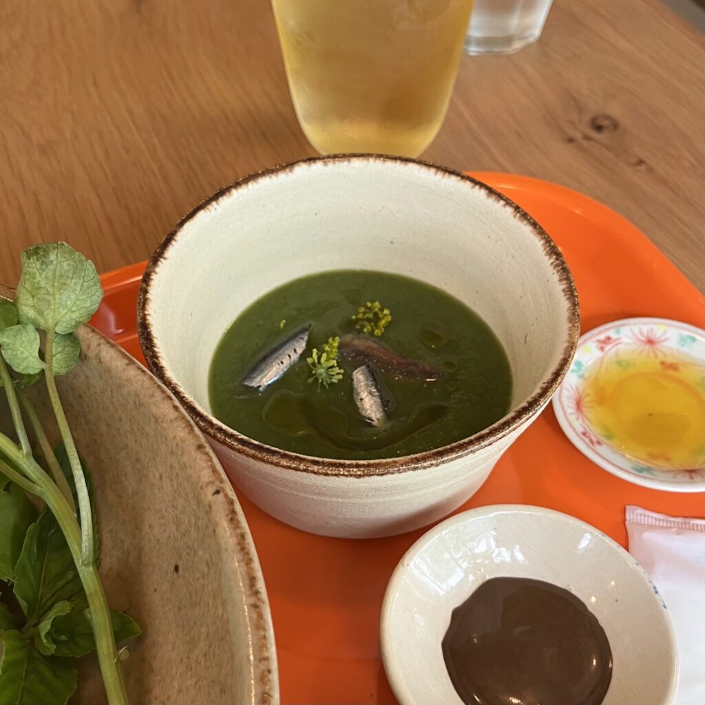 その日のおかずは、キュウリの冷製スープでした。キュウリの風味に加え、フルーティーな酸味が感じられる爽やかな味わい。上に乗っている自家製アンチョビやハーブと一緒にいただくと、味の重なりをより一層楽しむことができ、こちらも感動級のおいしさでした。