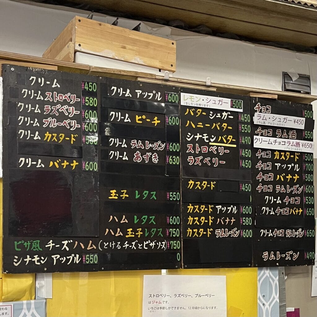 クレープは魅力的なメニューがこんなに! お食事系のものもラインナップされていて、どれにしようか悩んでしまいます。