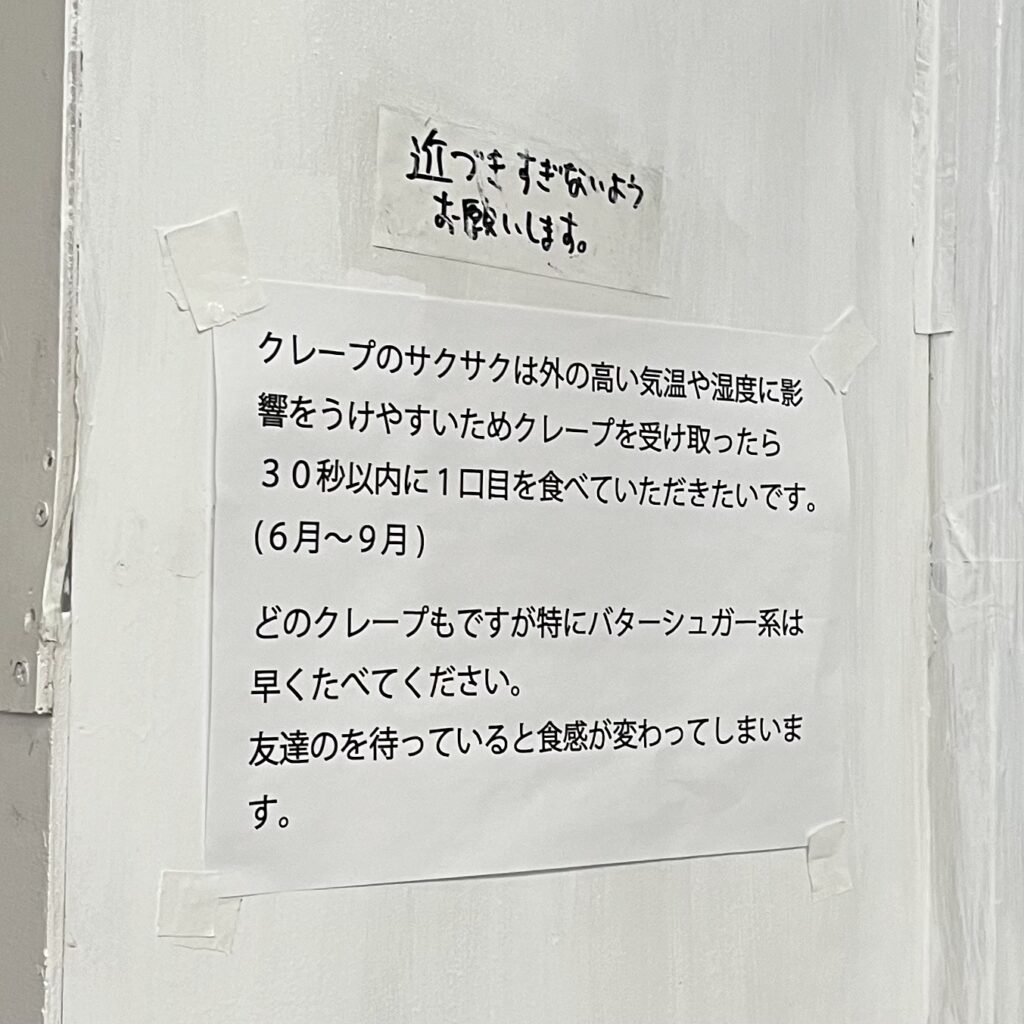 さらに、「クレープを受け取ったら30秒以内に一口目を食べる」ことをすすめる貼り紙も。私もそのアドバイスにならい、準備しておいたスマホで写真を撮って、急いでひとくちいただきました。