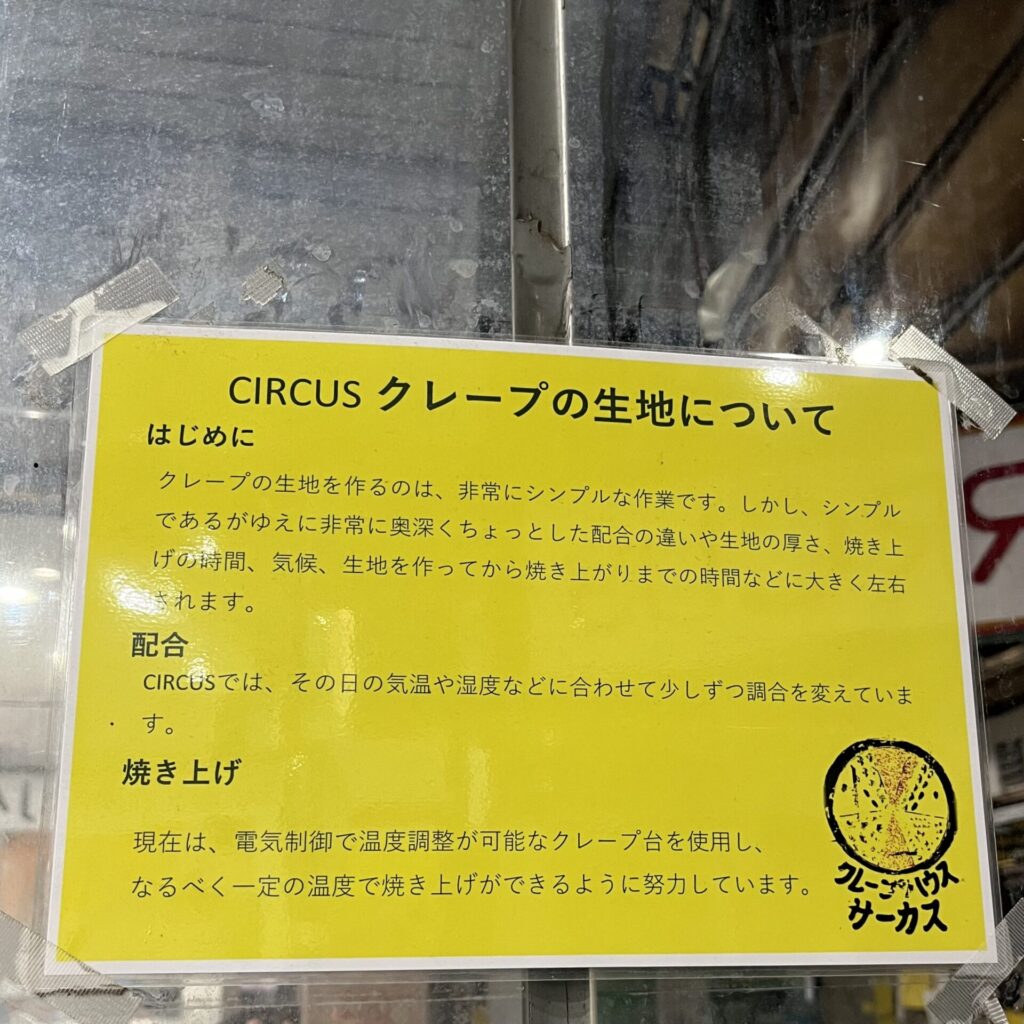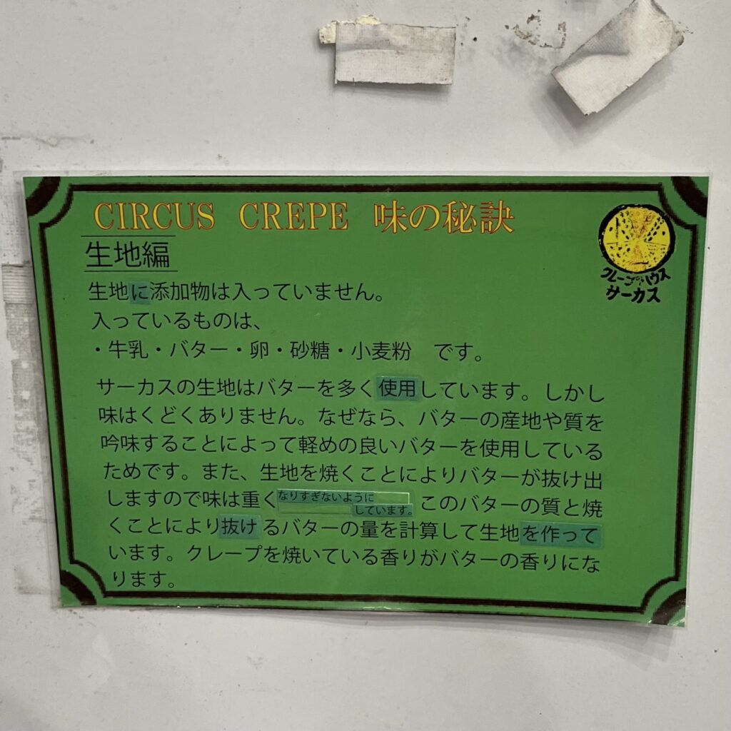 店先にはクレープ生地にまつわる解説が貼られており、クレープの受け取り待ちの間に読むことができました。そのおかげで、これからいただくクレープがますます楽しみに。