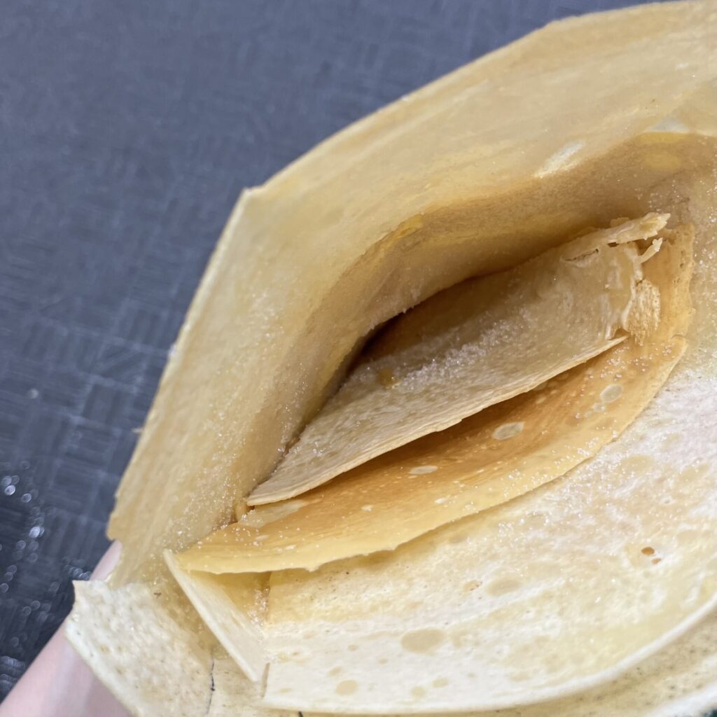 焼きたてのクレープはほんのりあたたかく、パリッパリ! 小麦とバターの香りをしっかり感じることができる薄めの生地は、まさにパリパリ系クレープに求める理想の味わいです。