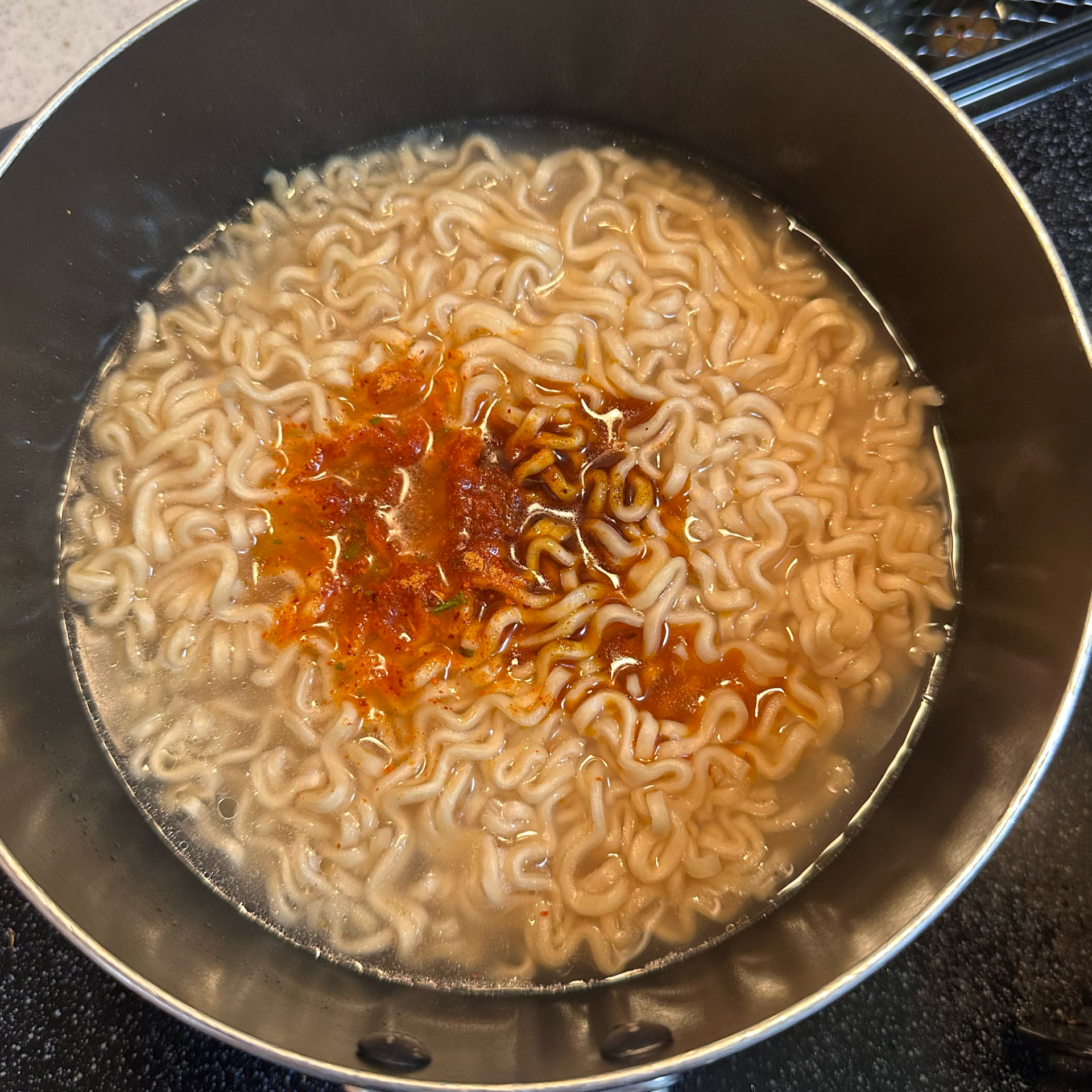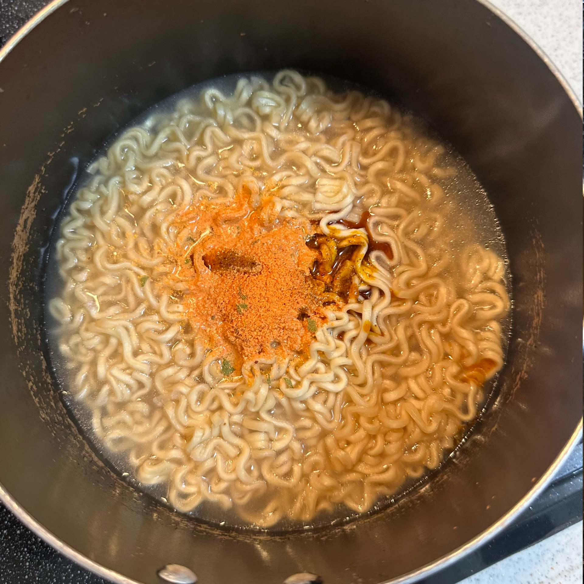 ②火を止めた状態で、付属の粉末スープと調味油を加える