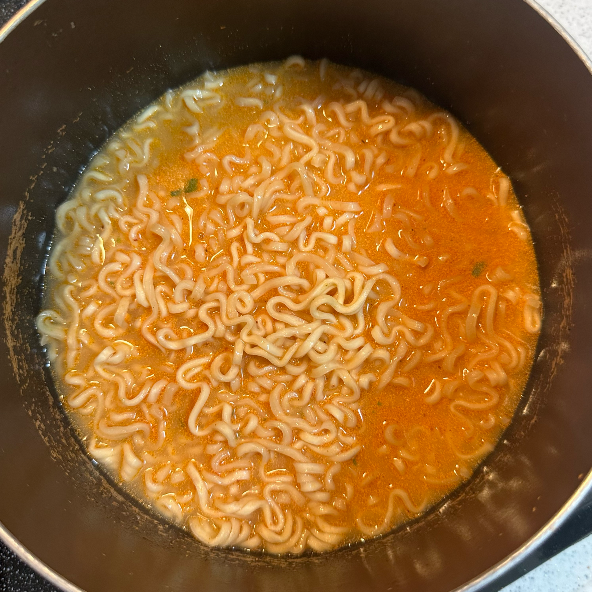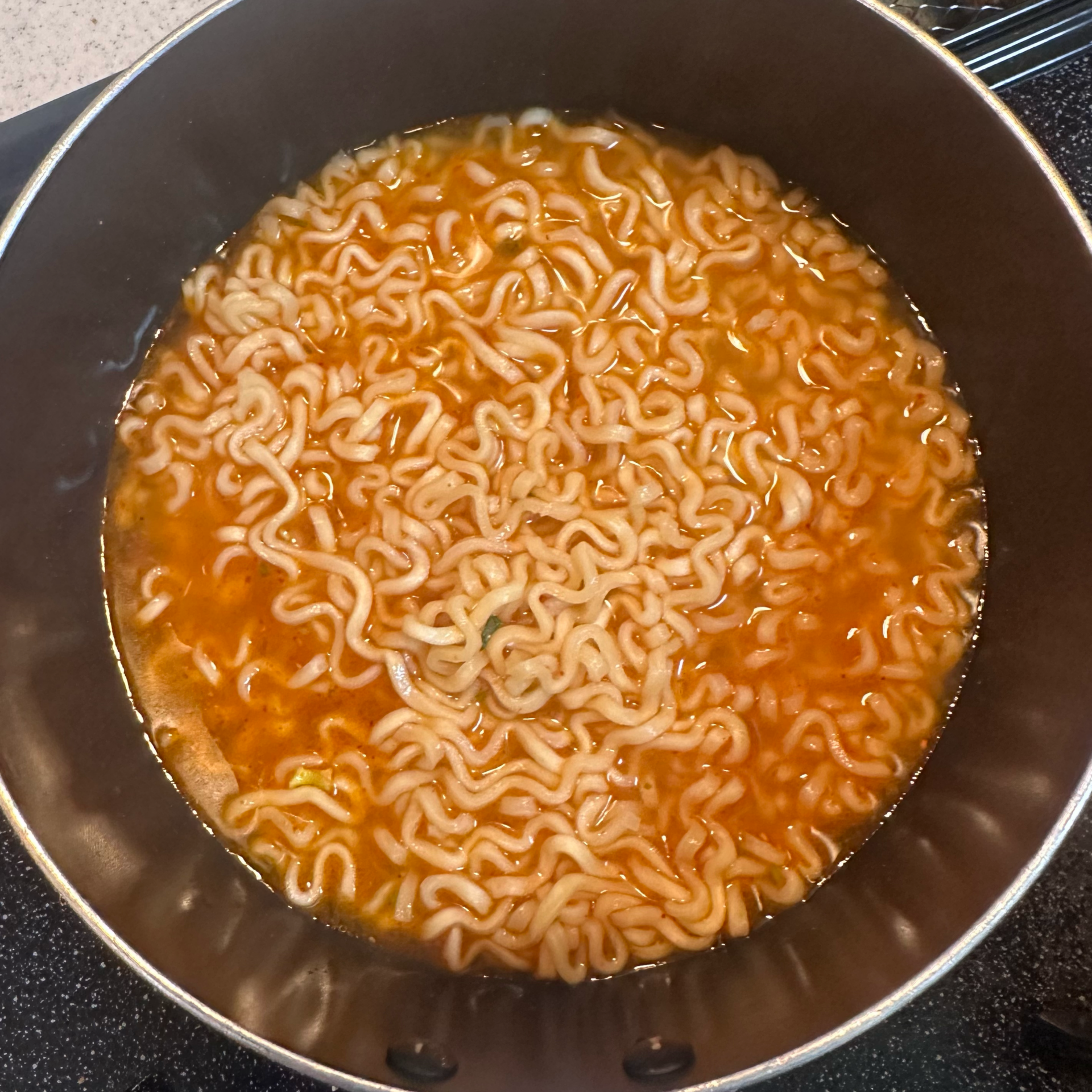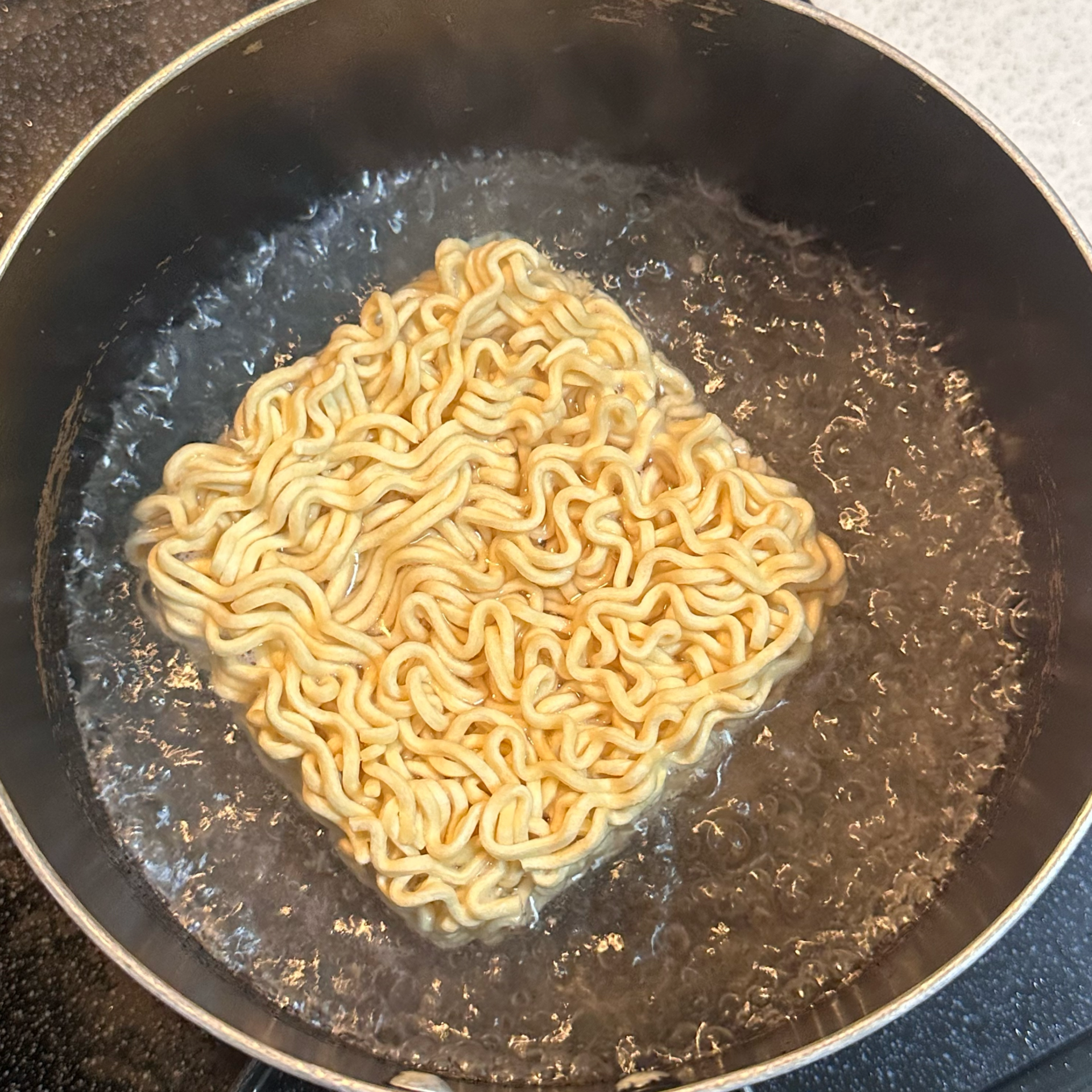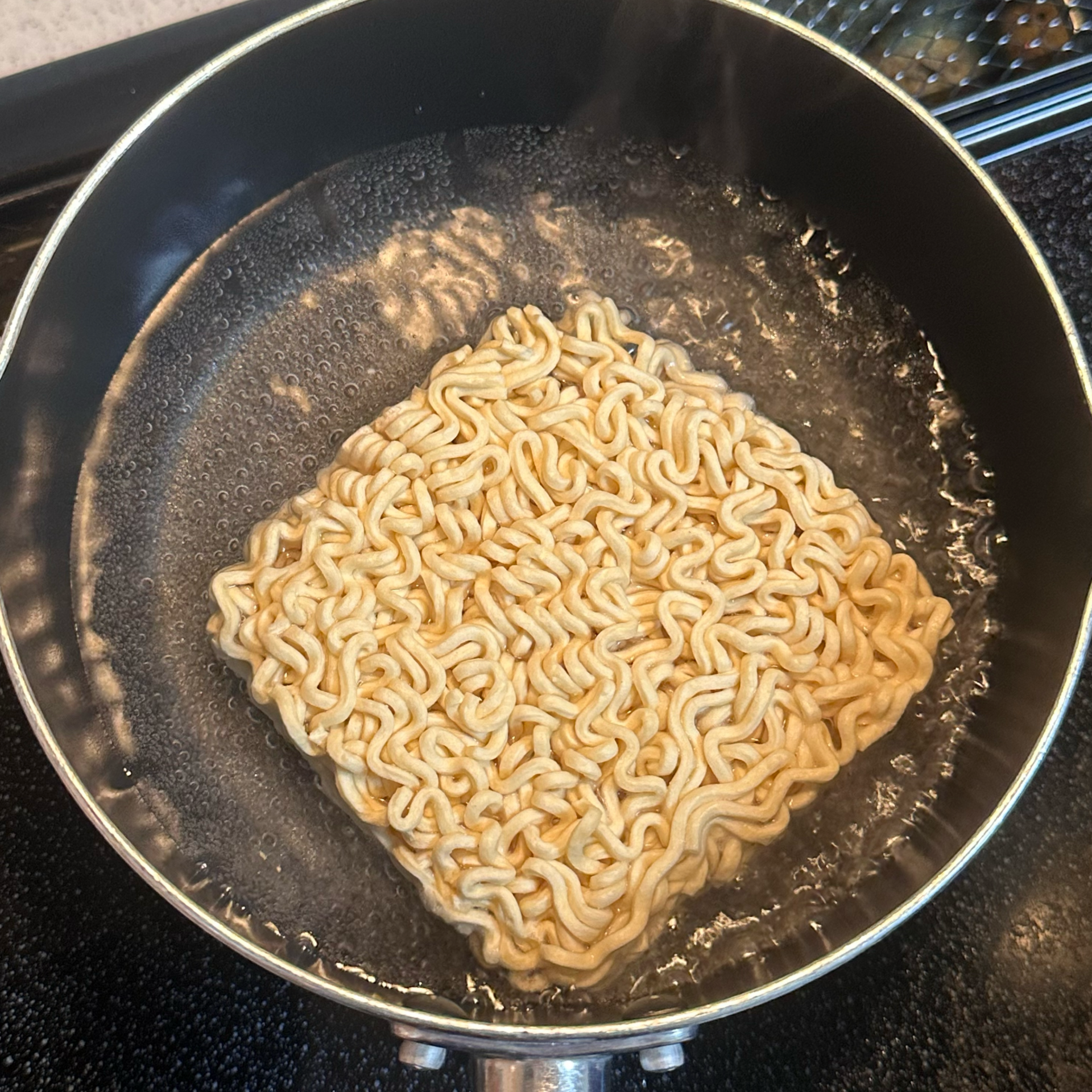 ①沸騰したお湯400mlに麺を入れ、ほぐしながら4分ゆでる