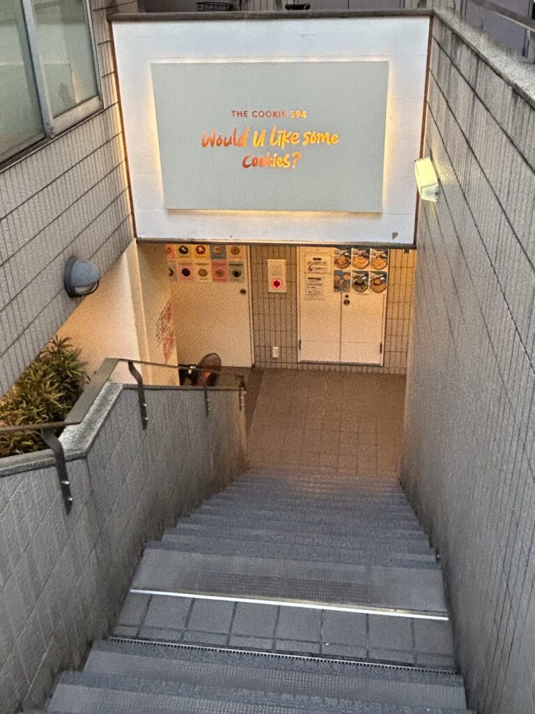 新大久保駅から徒歩で約2分。駅の西側、階段を下った先の地下1階に「THE COOKIE 594」はお店を構えています。「Would u Like some cockies?」と書かれた大きな看板が目印です!