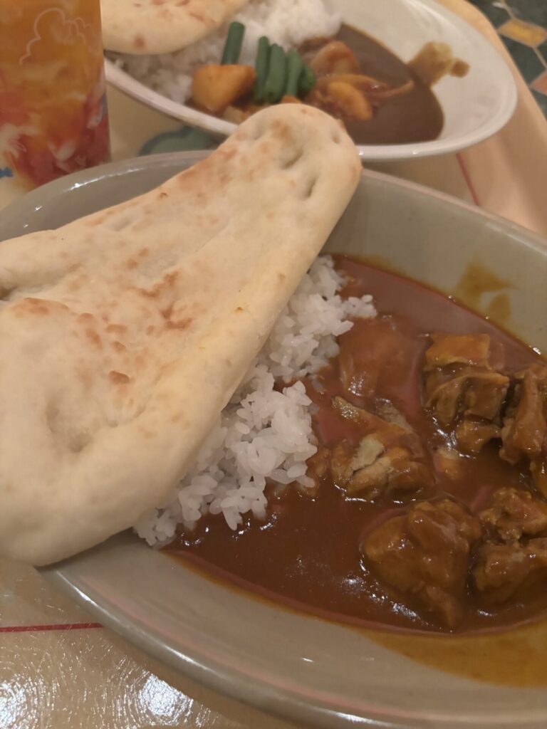 夜ご飯は、カスバ・フードコートでチキンカリーとラッシーを注文しました🥭チキンカレーはとても甘口で食べやすいので辛いのが苦手な方にもおすすめです!