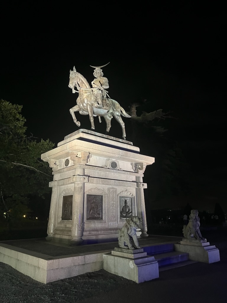 城はありませんが、あの有名な伊達政宗公の像があります! 夜はライトアップもされていて、昼間とはまた違った雰囲気を楽しめます!