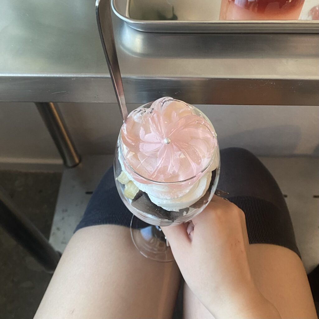 そして、このパフェ🌸お花のゼリーが上に乗っていて写真映えすぎる!食べるのが本当に勿体ないくらい可愛い🥹中にはチョコブラウニーとバナナ、一番下にゼリーが入ってるよ。食べる前に写真を沢山撮っちゃお〜📸