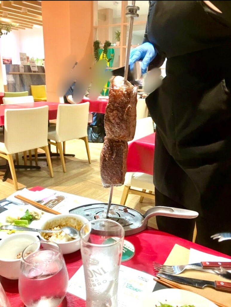 各テーブルに串に刺したお肉やお野菜、チーズなどを持ってきてもらえます。様々な肉の部位をおいしさを目いっぱい楽しめる方法で調理してあり、どれもおいしく頂きました。