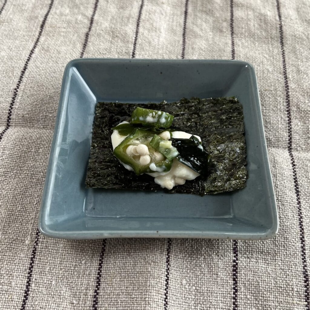 3つ目は、のりで巻いていただく食べ方です。ちょうどいい大きさにカットした焼き海苔に、オクラとわかめ、豆腐をひとすくい。タレか塩をかけて、一口でいただきます。海苔のパリパリさと磯の香りが豆腐との相性抜群で、いくらでも食べられてしまいます。