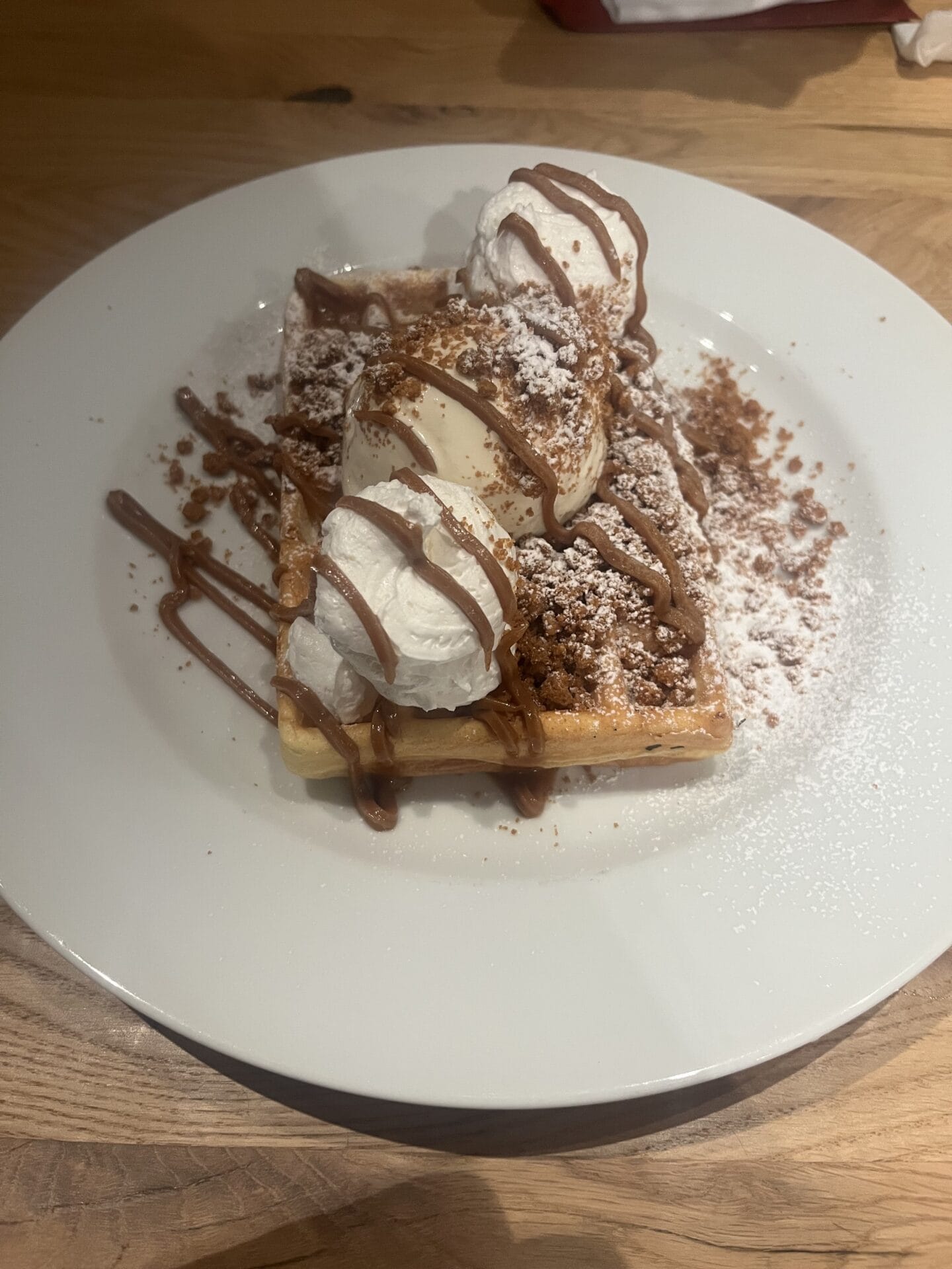 もちもちな焼きたてワッフルの上に生クリームとバニラアイスが乗っかっていて、さらにその上からベルギー生まれの「ビスコフクッキー」のクランブルとキャラメールソースがたっぷりかかっています!