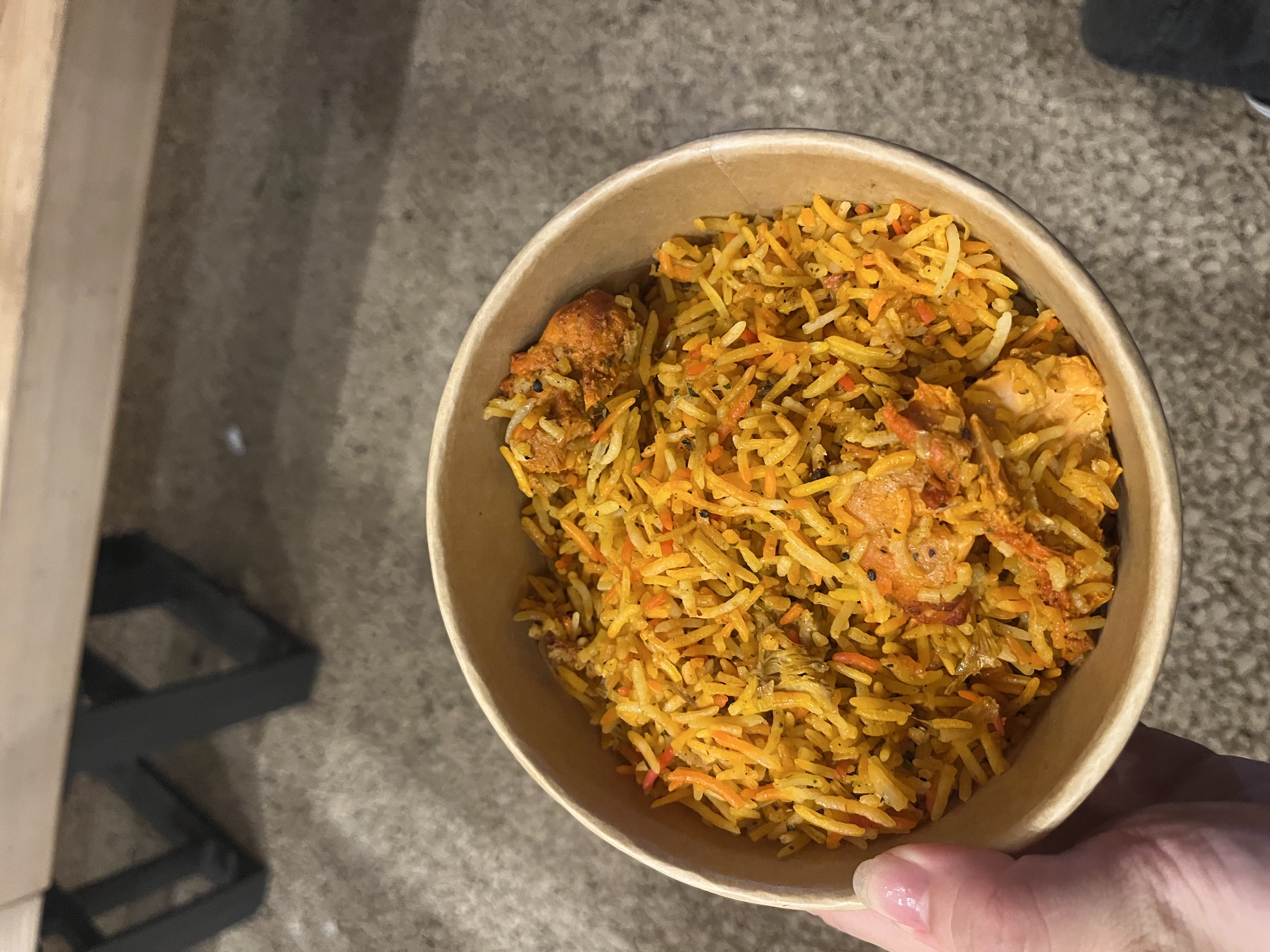 そのお店の一つである「ビリヤニ&モモハウス」というテイクアウト専門店でビリヤニを購入しました!ビリヤニとは、南アジアを中心に食べられているスパイスとお肉の炊き込みご飯です。