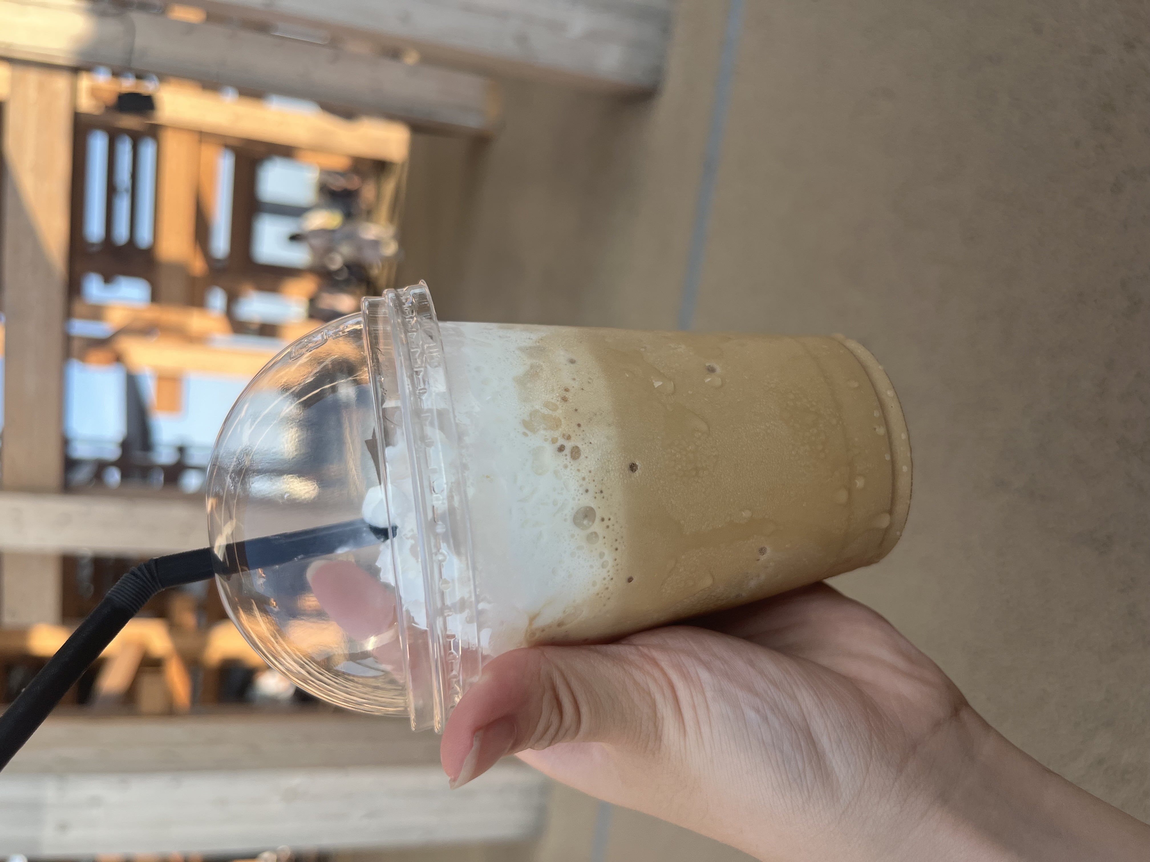 コーヒーと氷が混ざった飲み物部分には、甘さはほぼなく、少しコーヒーの苦さを感じることができました。ホイップクリームには甘さがあるので、混ぜてから飲むとほんのり甘くなって、味変を楽しむことができます。