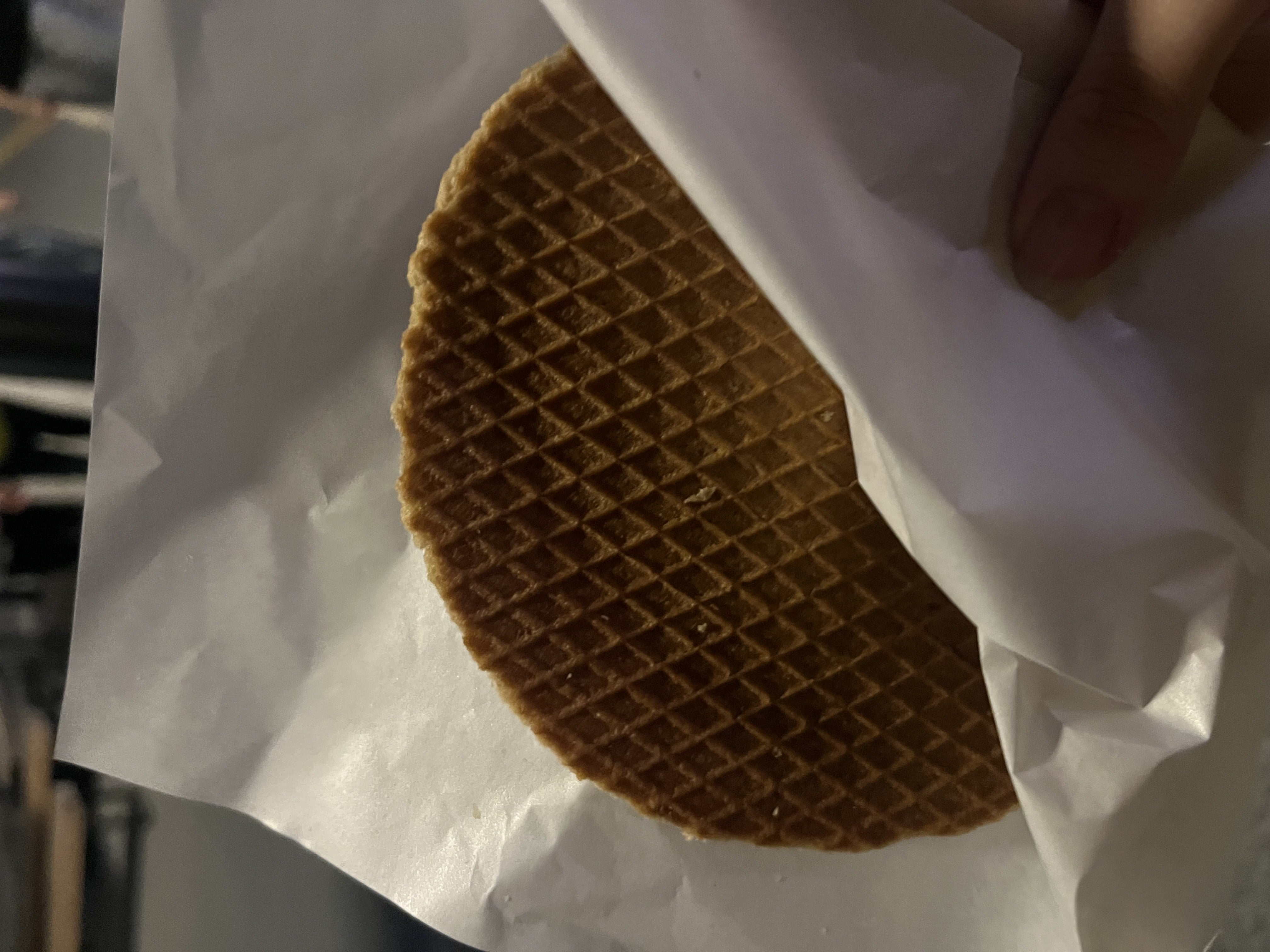 こちらのストロープワッフルの生地は焼きたてで、受け取ったときには熱々でした!焼きたてのワッフル生地は少ししっとりしていて、挟んであるキャラメルシロップもワッフルの熱でトロッとしていました。