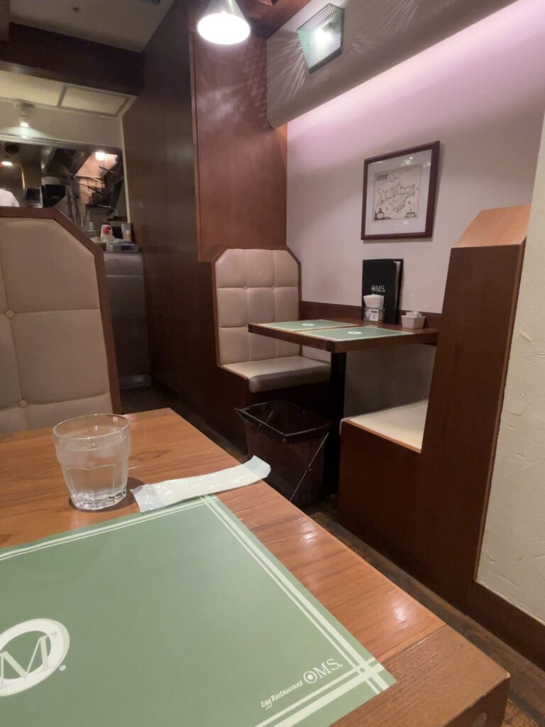 OMSの店内は、パリのおしゃれなレストランをイメージしているそうです!仕切りの壁が高く、ゆったりと落ち着けます。清掃が終わった席には、紙製ランチョンマットが敷かれており、高級感Max!