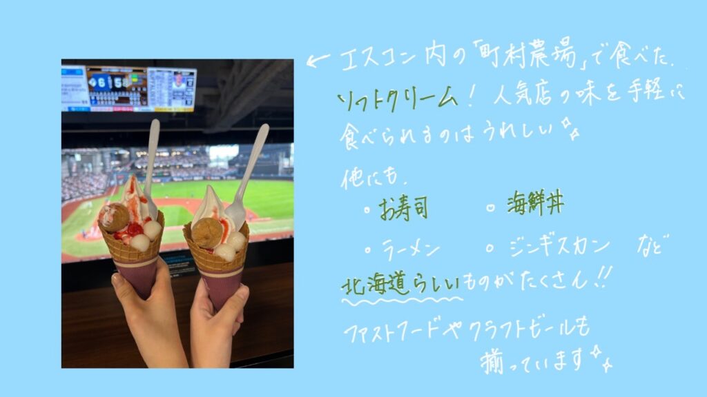 エスコンフィールド内には、北海道内の人気な飲食店が多数出店しています!そして、応援しながら食べやすいようにエスコン限定のメニューを出しているお店も沢山あります! 野球を観ながら、美味しい北海道のご飯を食べられるのはエスコンならではです!