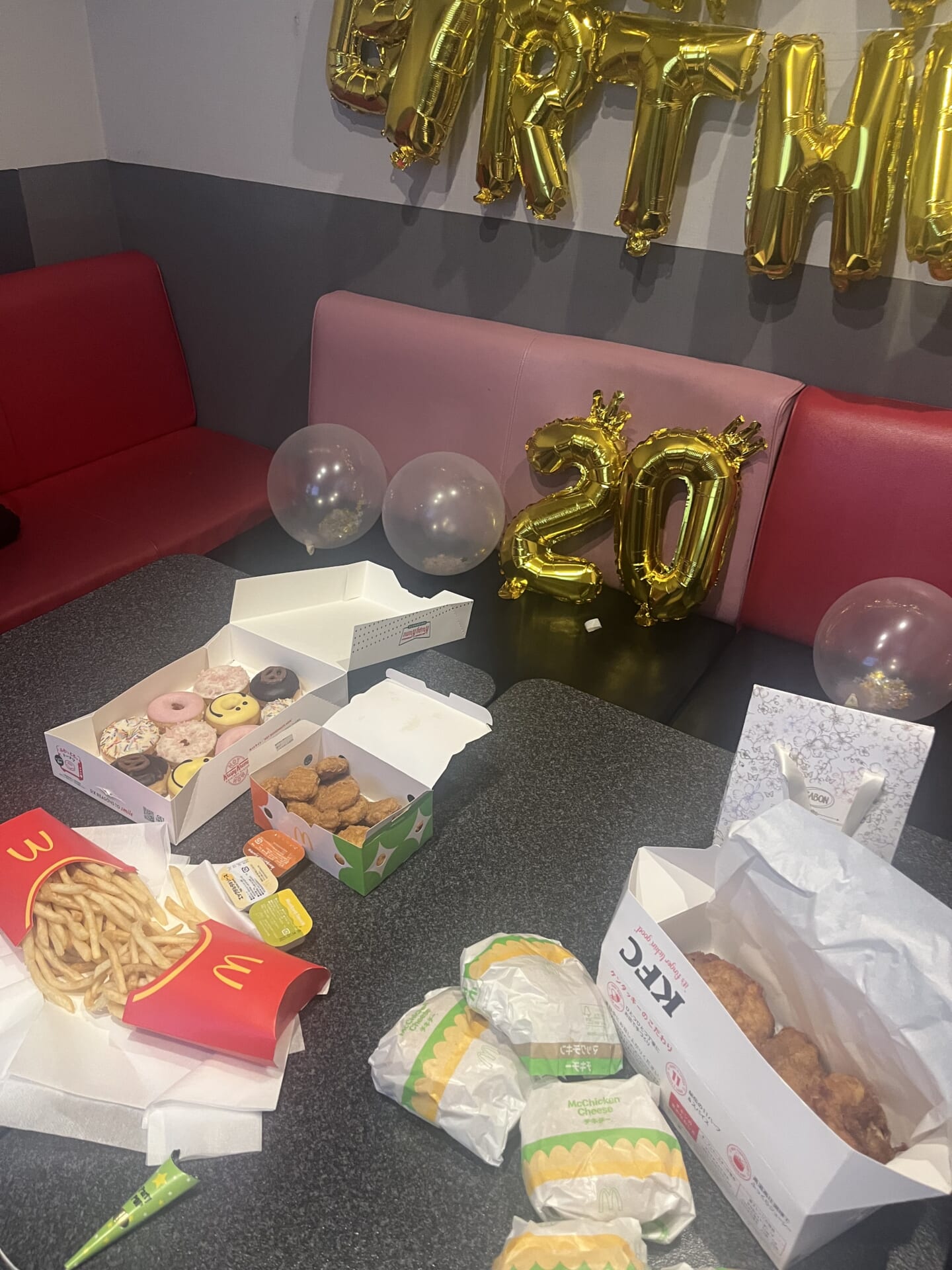 当日は、祝う子以外の4人のうち、2人は誕生日ケーキを持ってお店に先回りをして、飾りつけを。あとの2人で、祝う子を連れて「夜ご飯買って、カラオケで食べよう!」と言って、マックやケンタで、買い出しをしました!