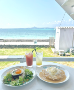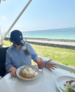 私たちは、ロコモコと塩キャラメルパンケーキをシェアしました!どちらも食べたかったので、シェアしてちょうどよかったです。綺麗な沖縄の海を眺めながら、おいしいごはんを食べれて、幸せな時間でした!
