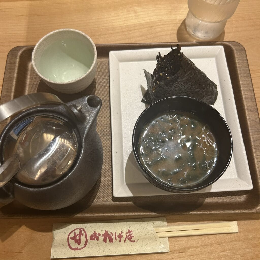 今回はおむすびセットを選びました。紀州南高梅・日高昆布・高菜のいずれかを選ぶことが出来て私は日高昆布にしました。おにぎりの大きさはコンビニくらいの大きさでさらに味噌汁(具あり)でお腹一杯になりました。ドリンクはほうじ茶にして、小さなやかんで提供されました。中はとても熱く、1時間ほど経っても温かいままでした。