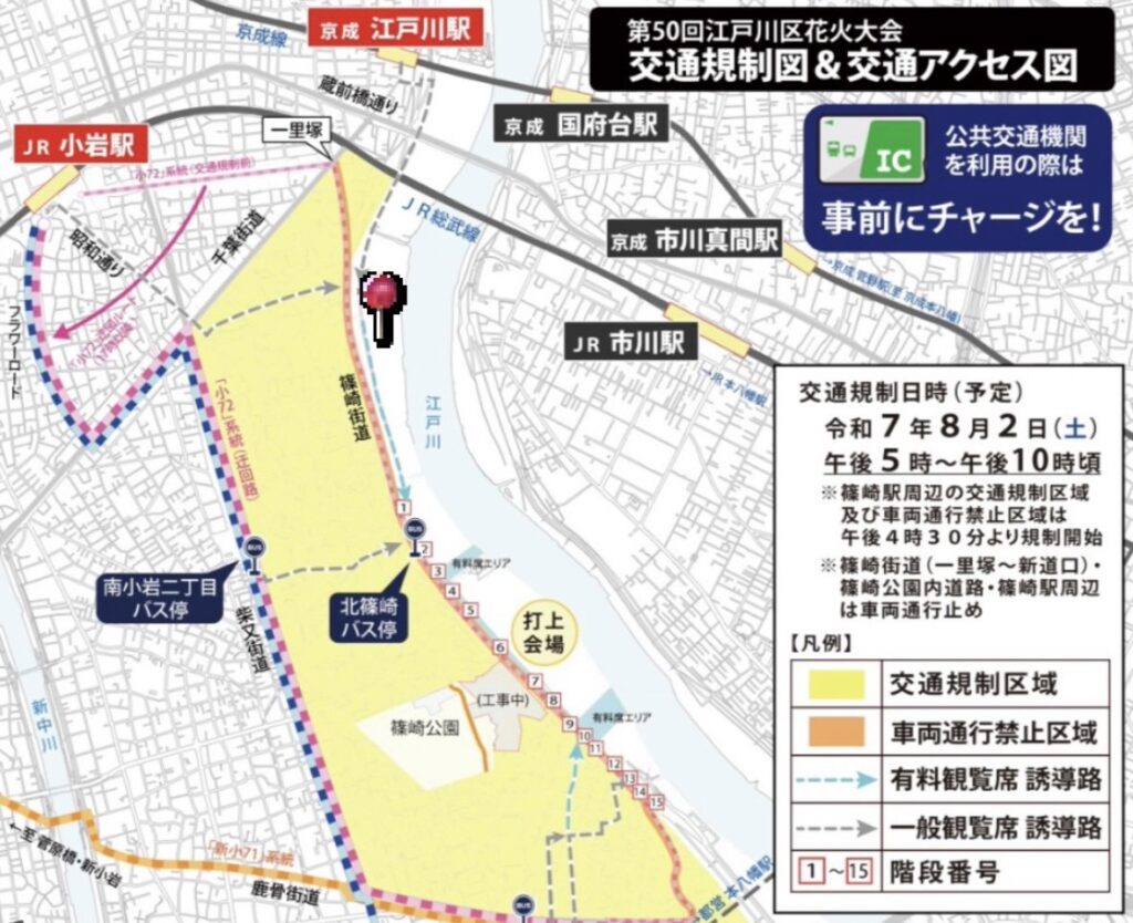 16:00~16:30頃に江戸川駅に到着し、17:00頃には河川敷で場所取りを始めるのが個人的に良さそうです🌟