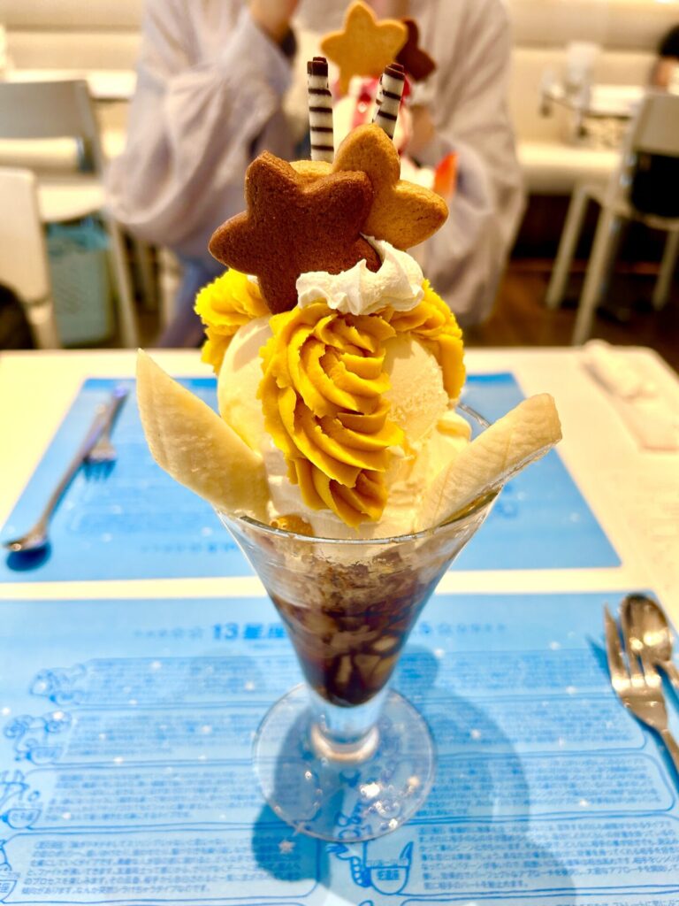 スイートパンプキンとさつまいもの生クリームにバナナや星型のチョコクッキーがついたパフェ。バニラアイスと濃厚なクリームを一緒に食べると、口の中に程よい甘さが広がり美味しさ満点✨