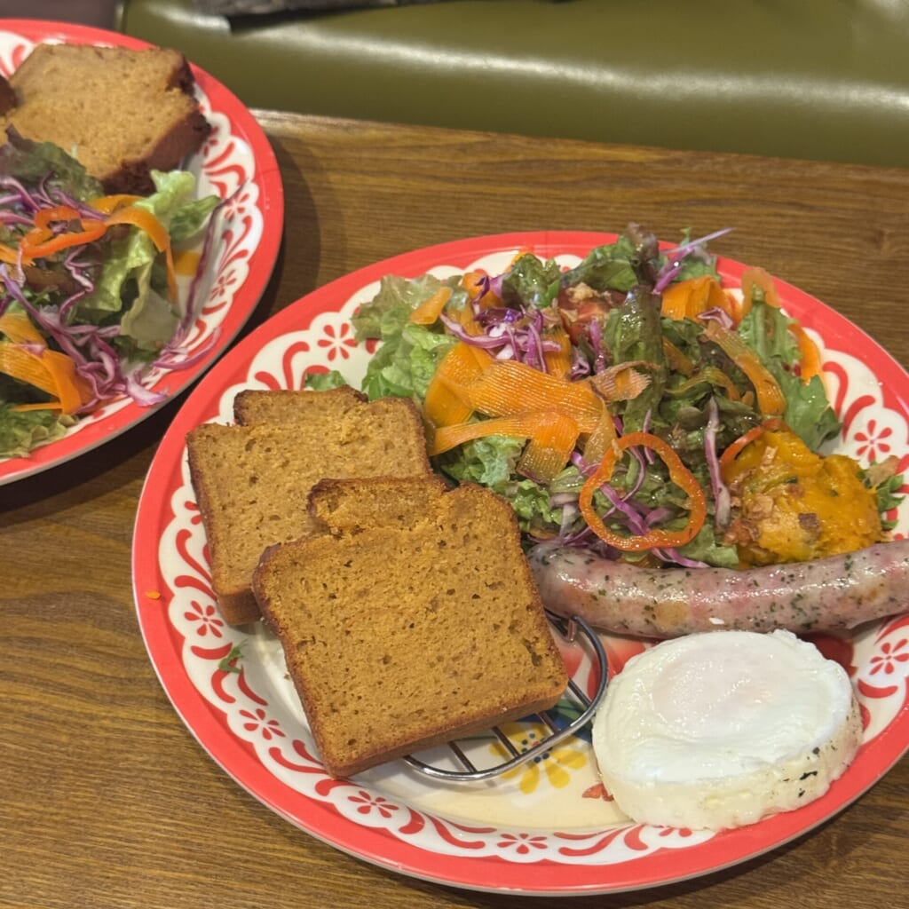 キャロットケーキとドレッシングが美味しいサラダ、目玉焼き、ハーブ入りのソーセージと、コーヒーか紅茶のセットでとてもボリューム満点です!!