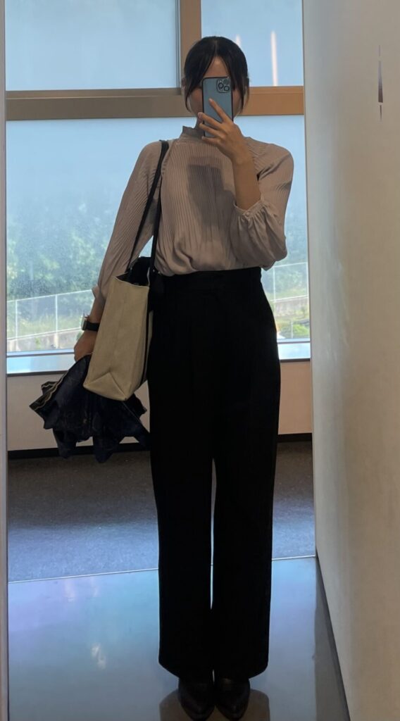 写真の通りオフィスカジュアルなコーデが多いです。業界によって異なると思いますが、今回私が参加した繊維商社や、広告業界は基本的にスーツを着て参加する学生の方が少ない印象でした。