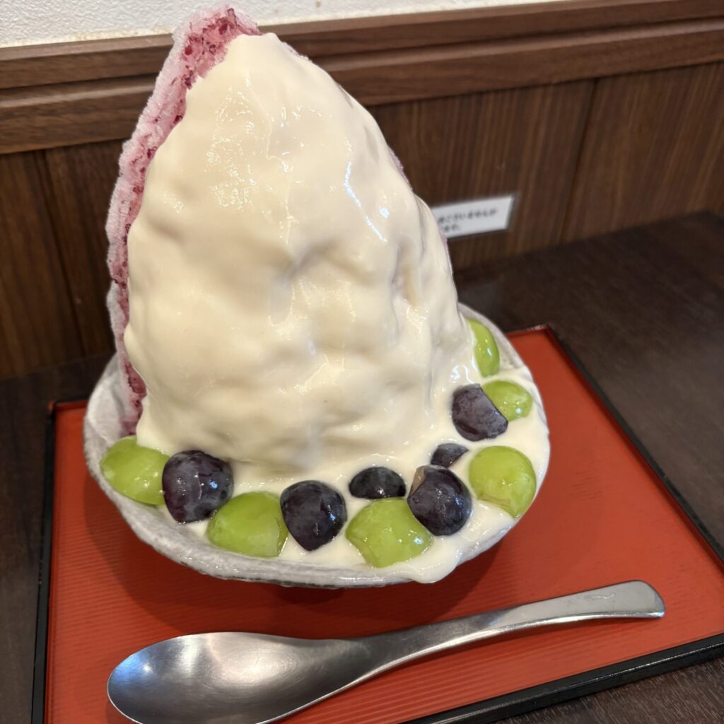 ヨーグルト餡の酸味とぶどうの甘さがよく合っていて、初秋にぴったりなかき氷でした!巨峰とシャインマスカットも沢山入っていました。